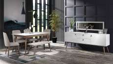 Наш продукт состоит из консоли, обеденного стола, 1 скамейки и 4 стульев.